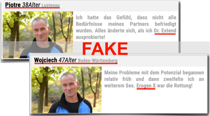 Im nächsten Schritt haben wir uns die Fotos noch ein wenig genauer angesehen. Bei unserer Recherche konnten wir fast alle verwendeten Fotos auch wieder auf anderen Verkaufsseiten von Abzockprodukten finden. So gibt es auf der Internetseite von Erogen X beispielsweise den Bericht von Wojciech, 47 Jahre alt und aus Baden-Württemberg.